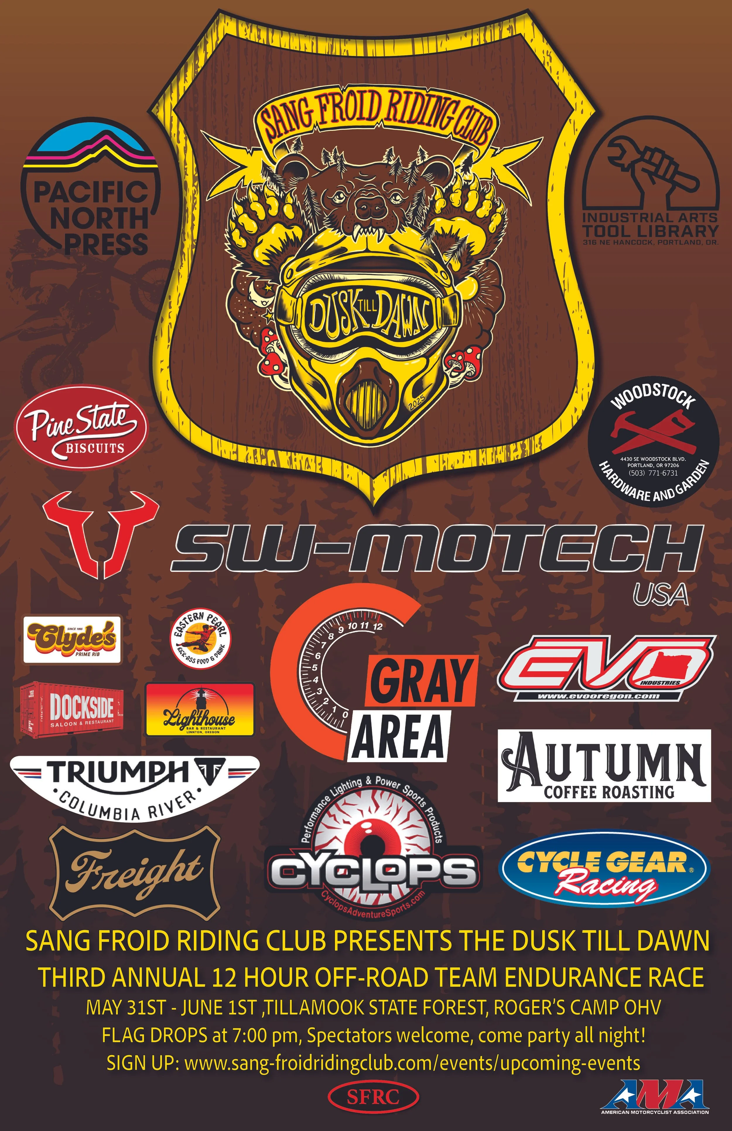Sang-Froid Riding Club is hosting a "Dusk till Dawn" 12-hour off-road endurance race, May 21st-22nd, in Tillamook State Forest! The race begins at 7pm and ends at 7am. There are classes for amateur and expert teams, as well as Ironman/woman riders. Max of 3 riders/bikes per team, each rider is allowed to use their own machine; Ironman/woman teams go it alone. The course uses non-technical trails, since we want this race to be fun and accessible for both newer and experienced off-road riders. This race will also be a hoot for spectating, as it’s a loop race and will provide spectators with lap after lap of motorcycle racing for 12 hours through the night!